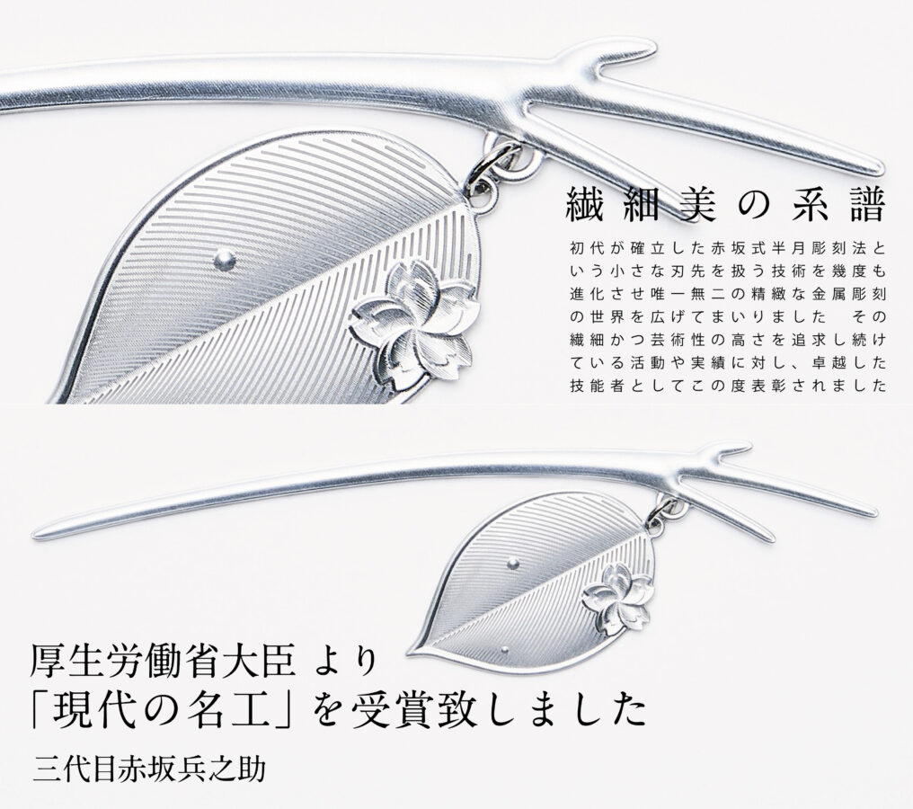 初代・赤坂兵之助が確立した『赤坂式半月彫刻法』と独自の「半月一枚刃Ⓡ」による深く鋭い彫り。